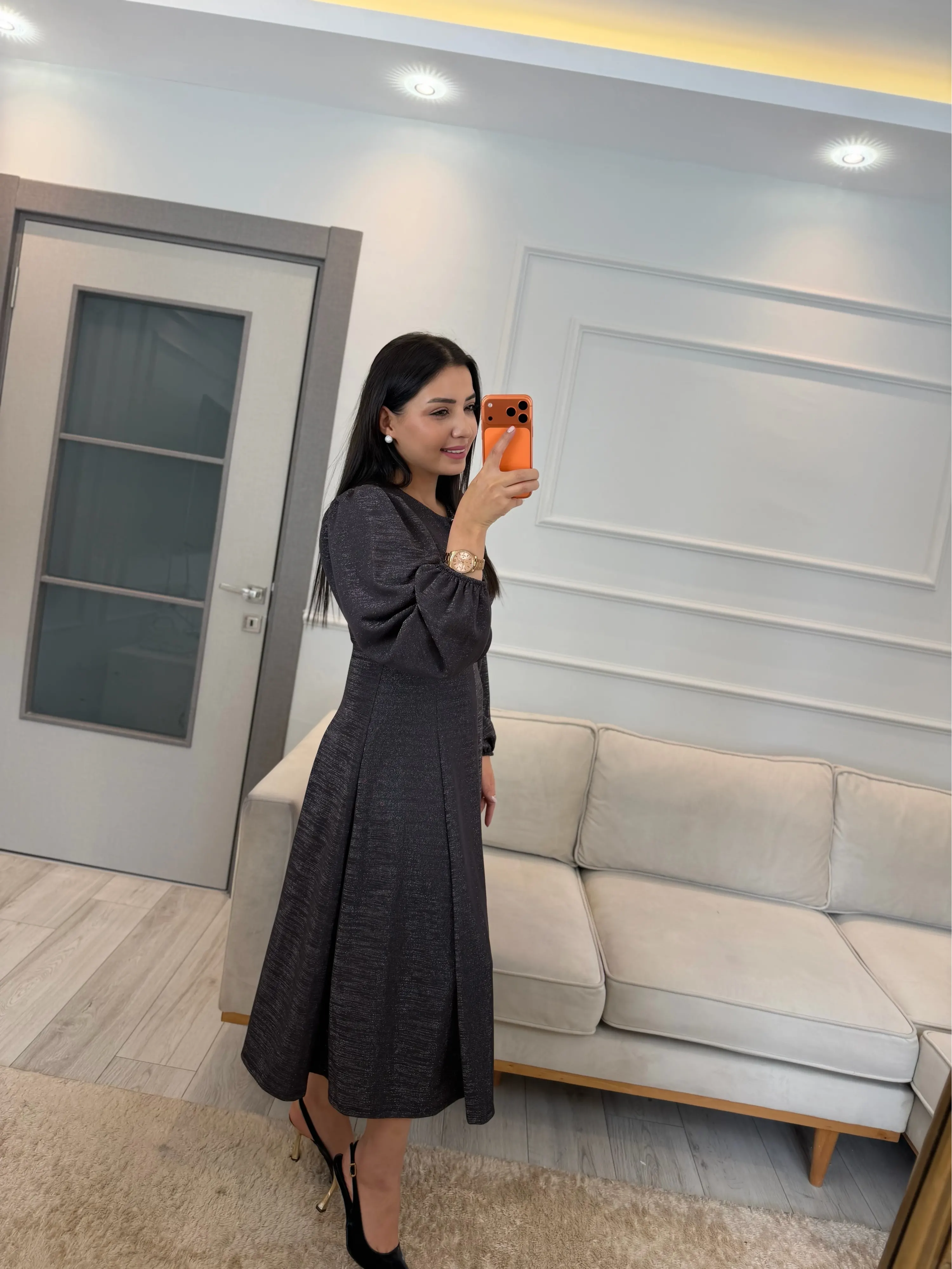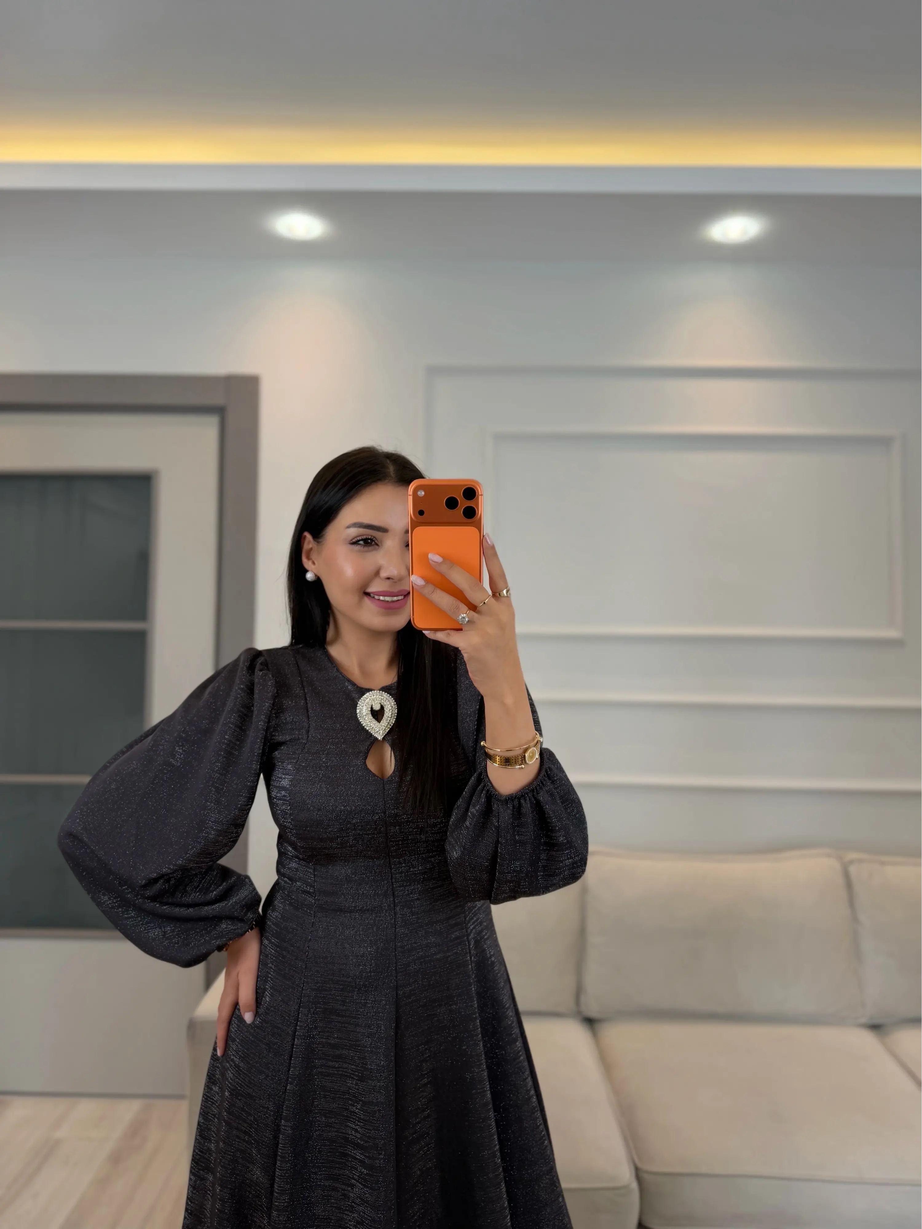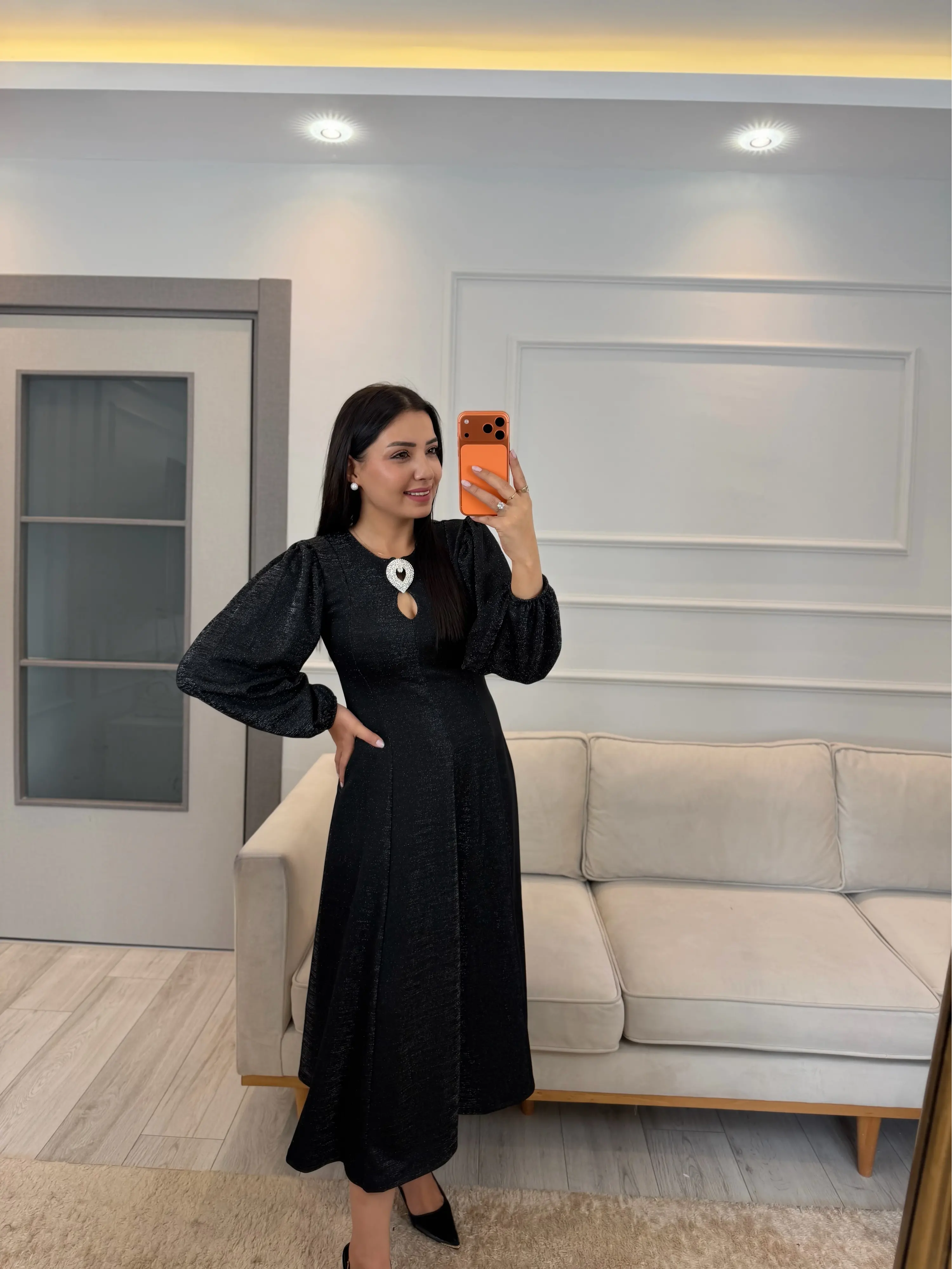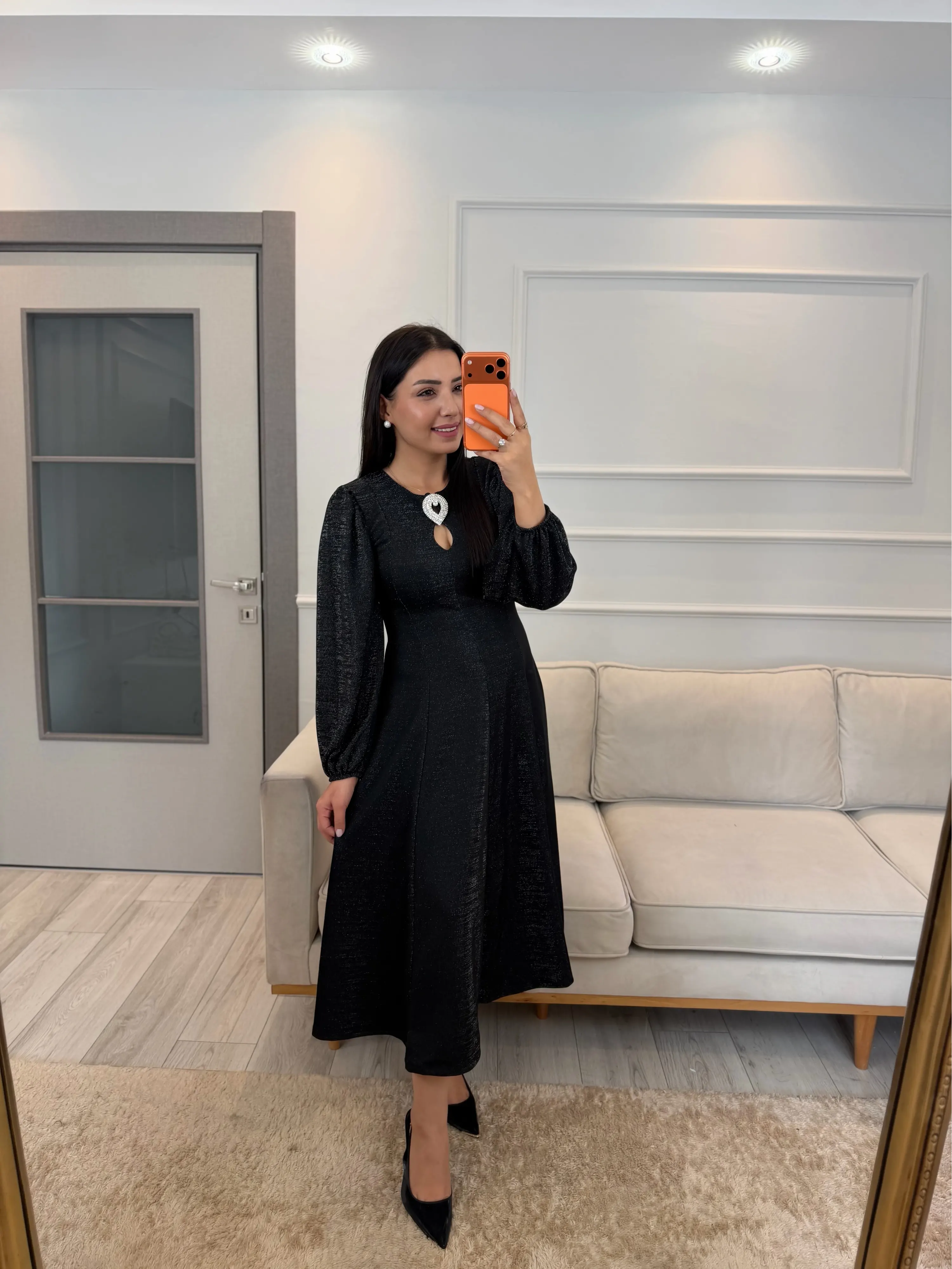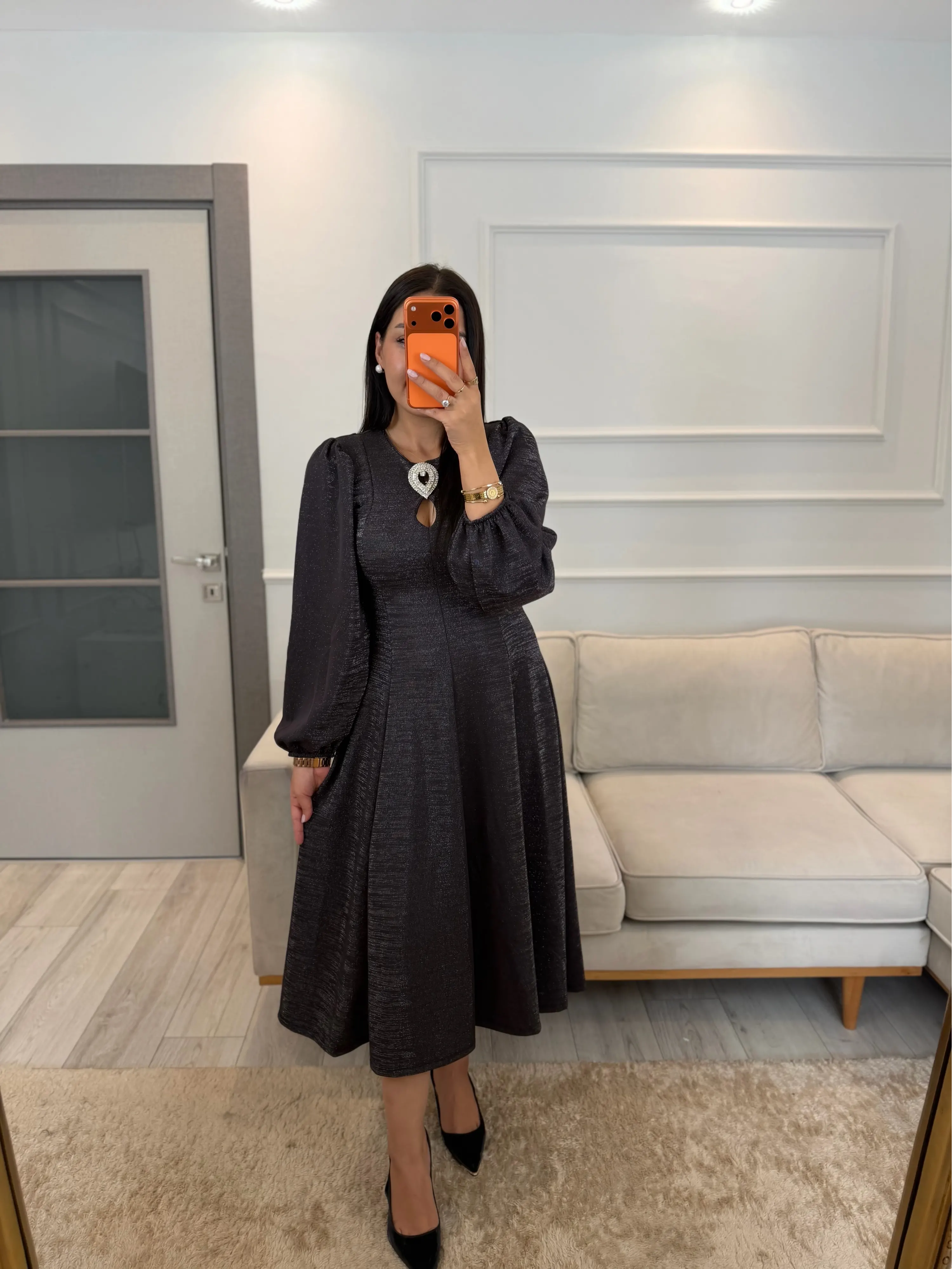 Ön Broşlu Simli Elbise