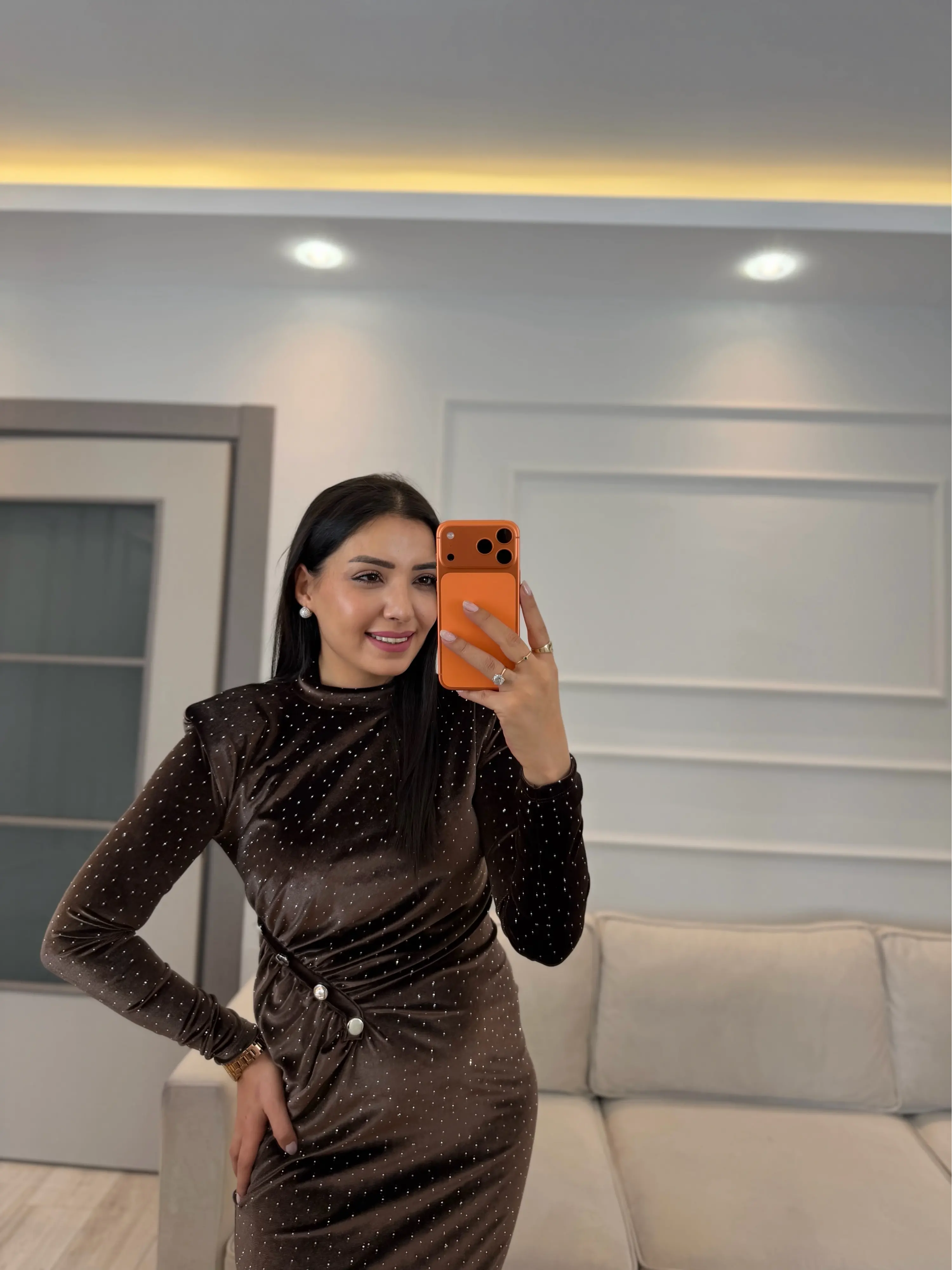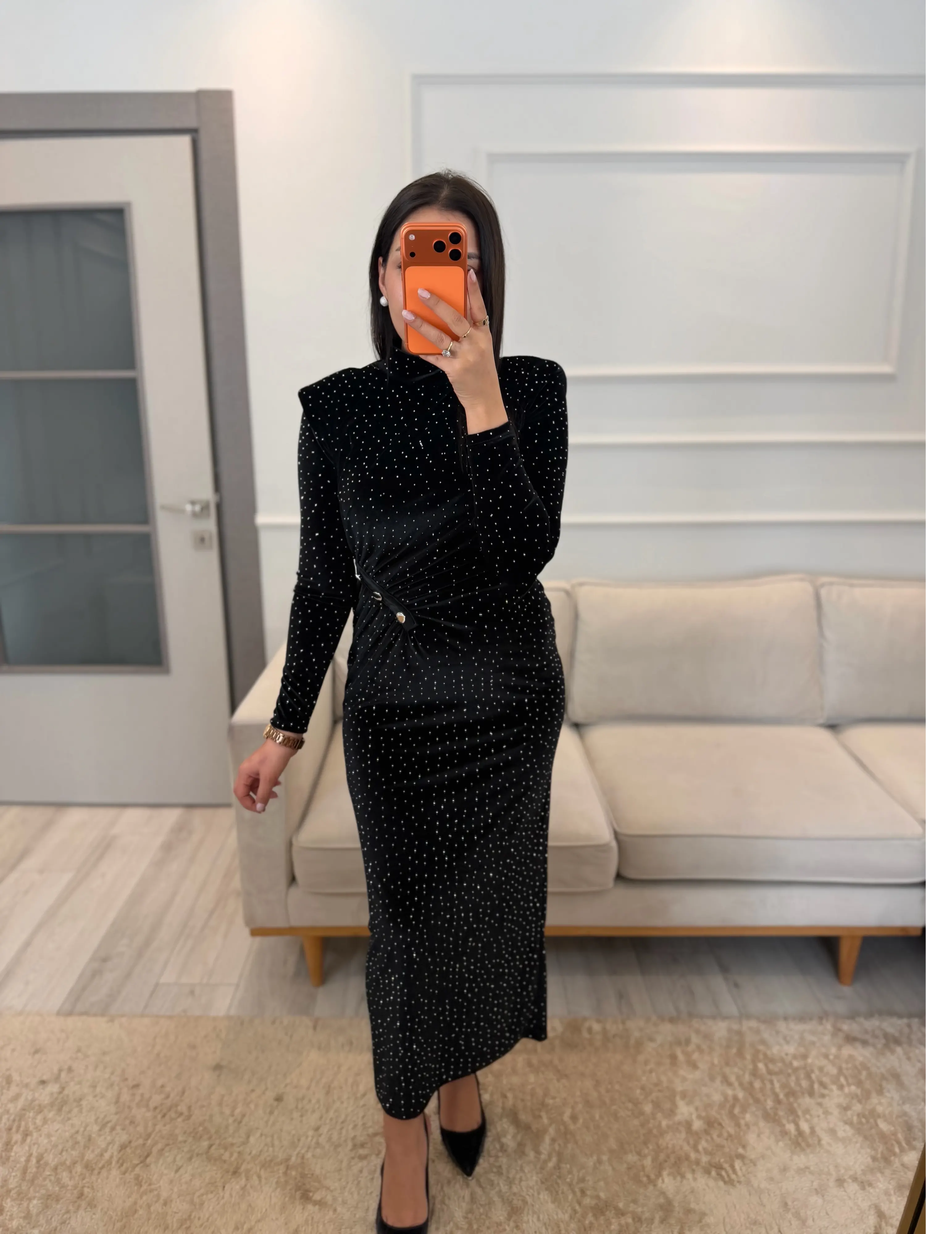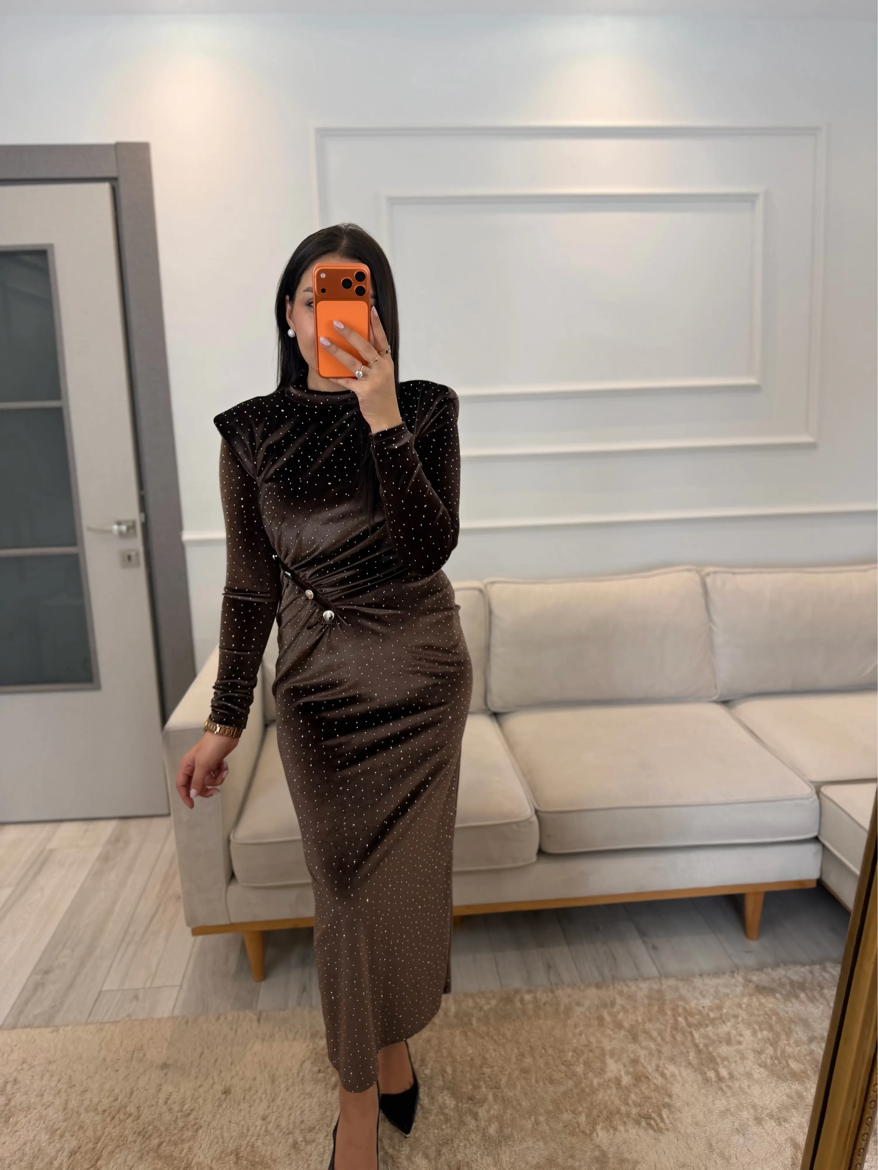 Serpme Taşlı Ön Düğmeli Kadife Elbise