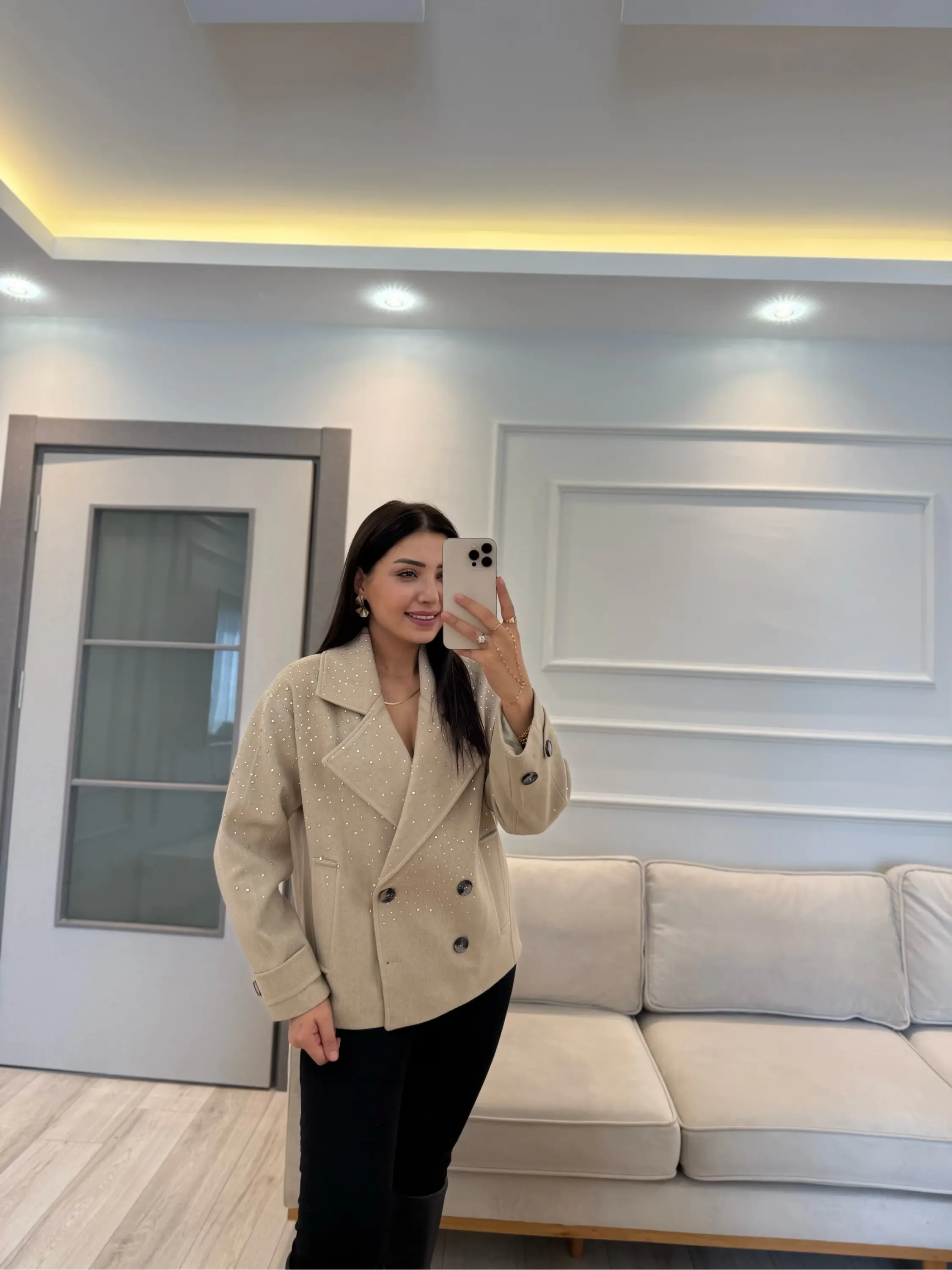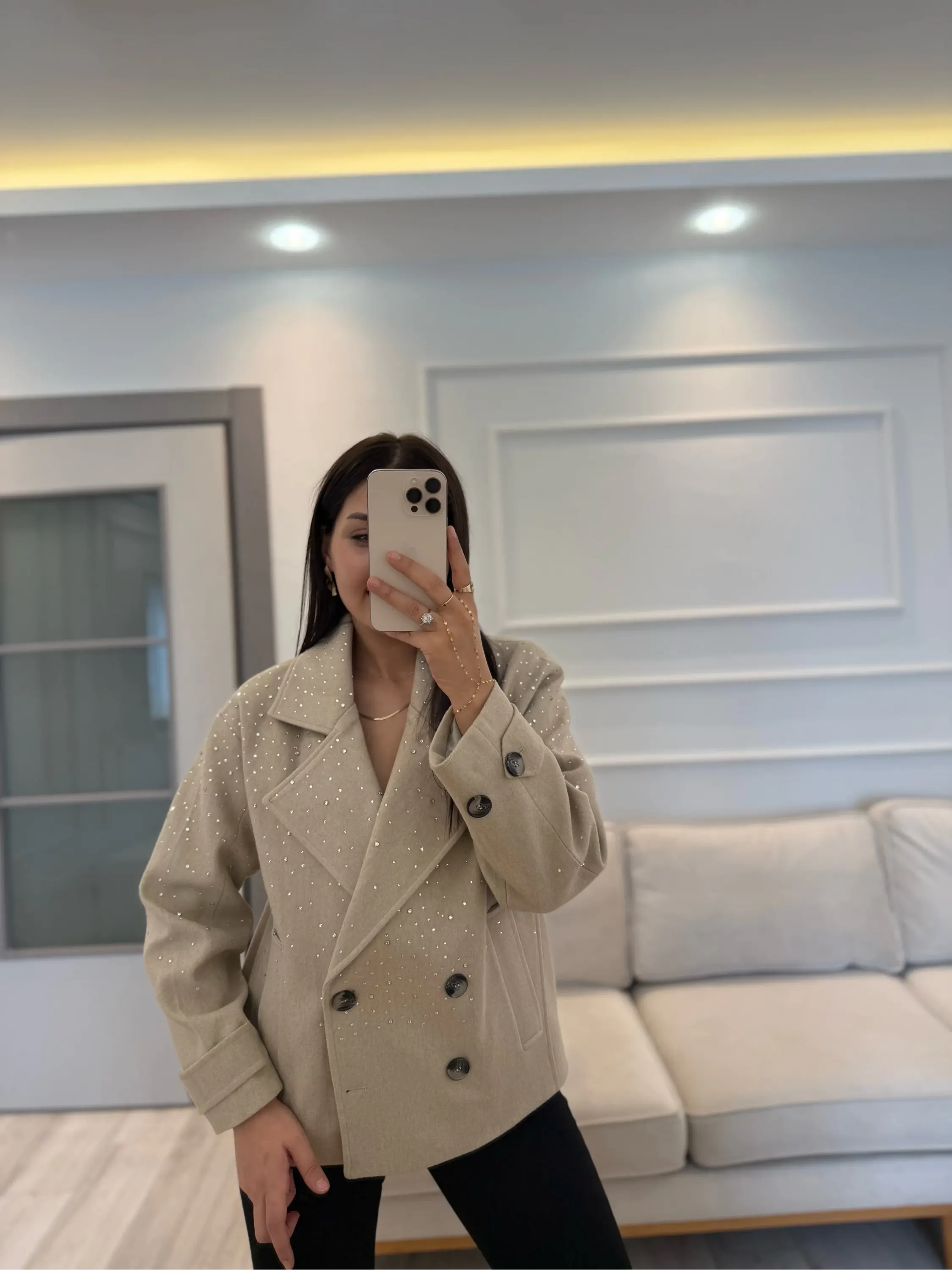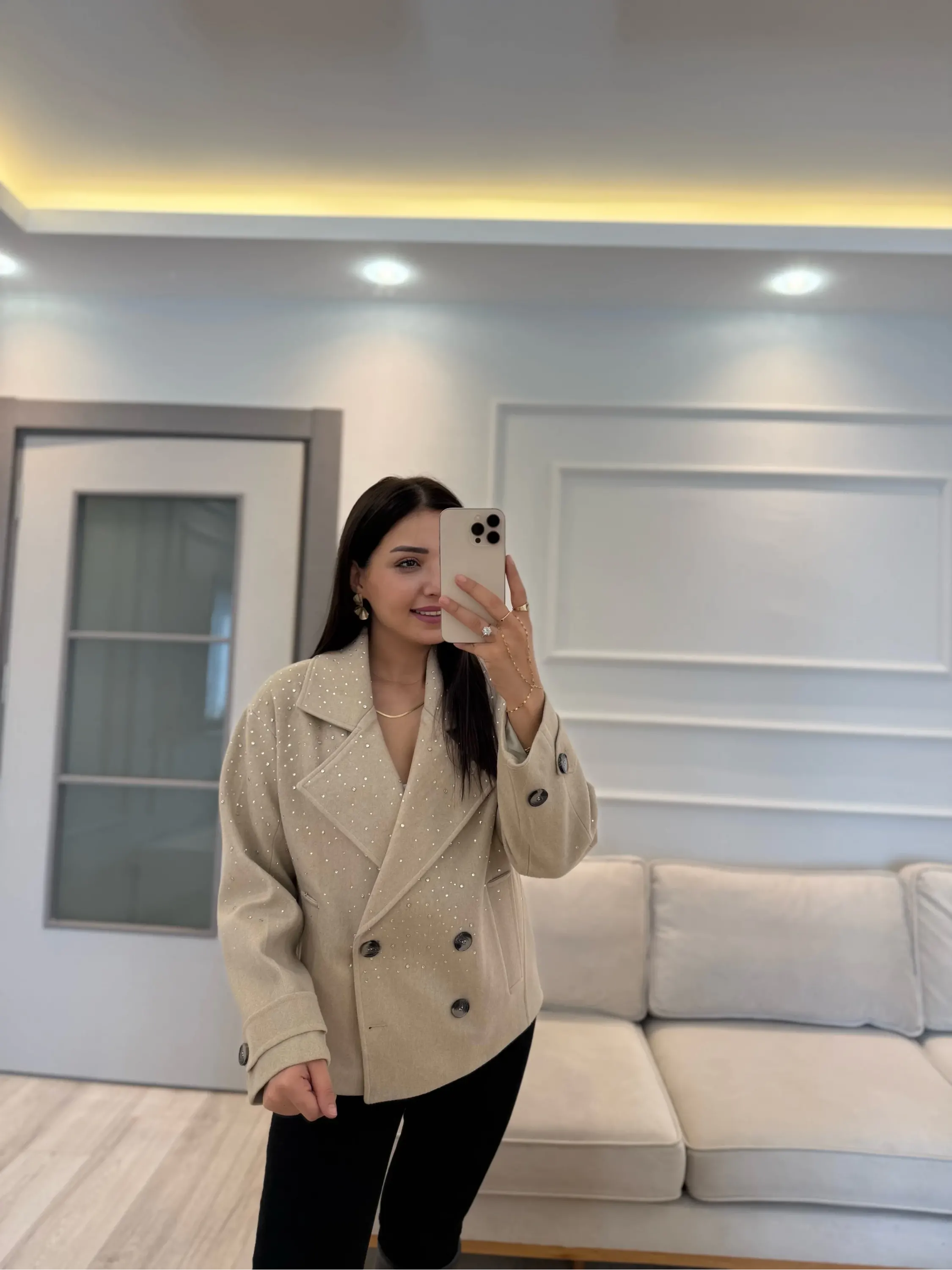 Tasarım Taşlı Kaşe Kaban