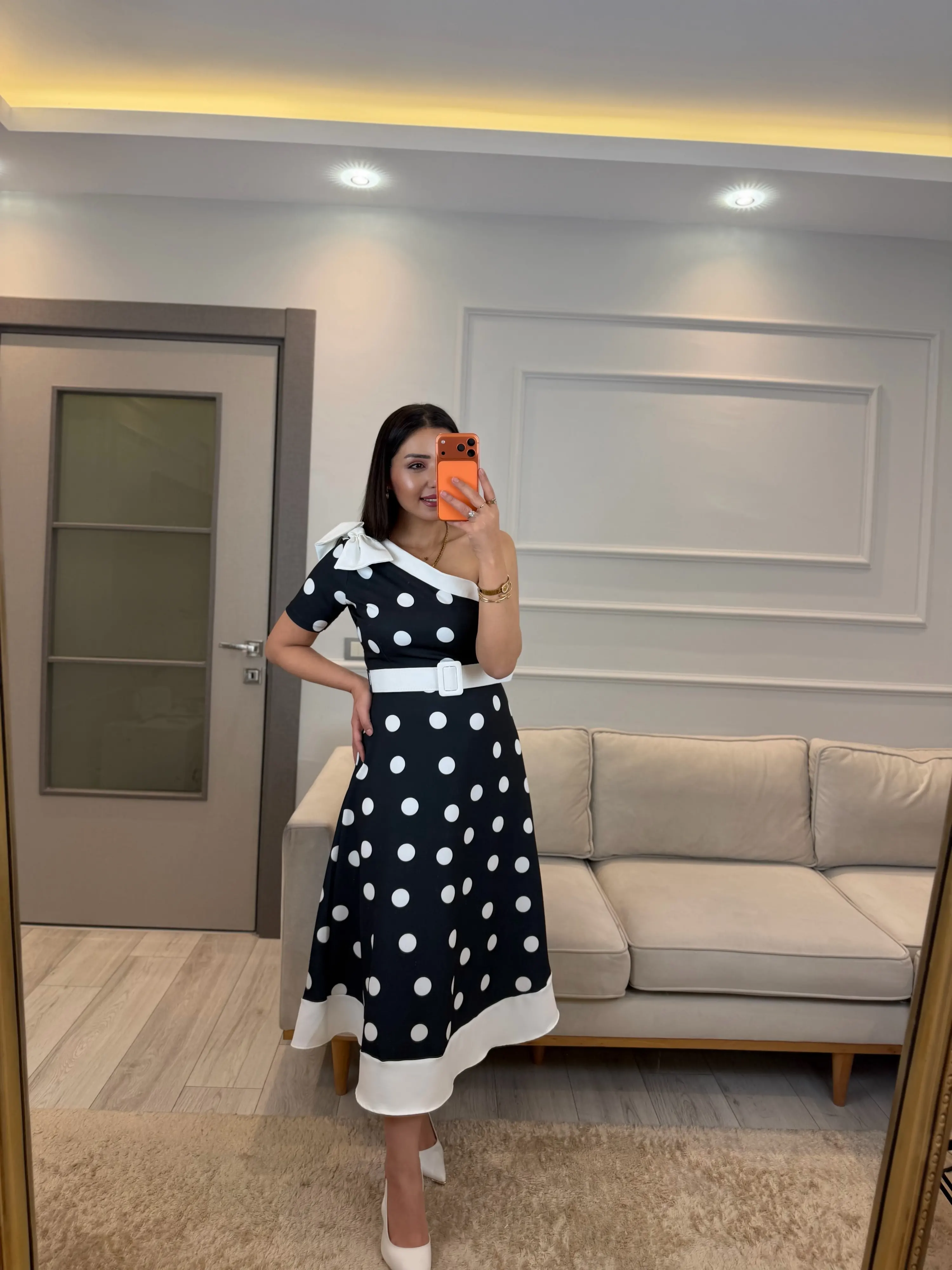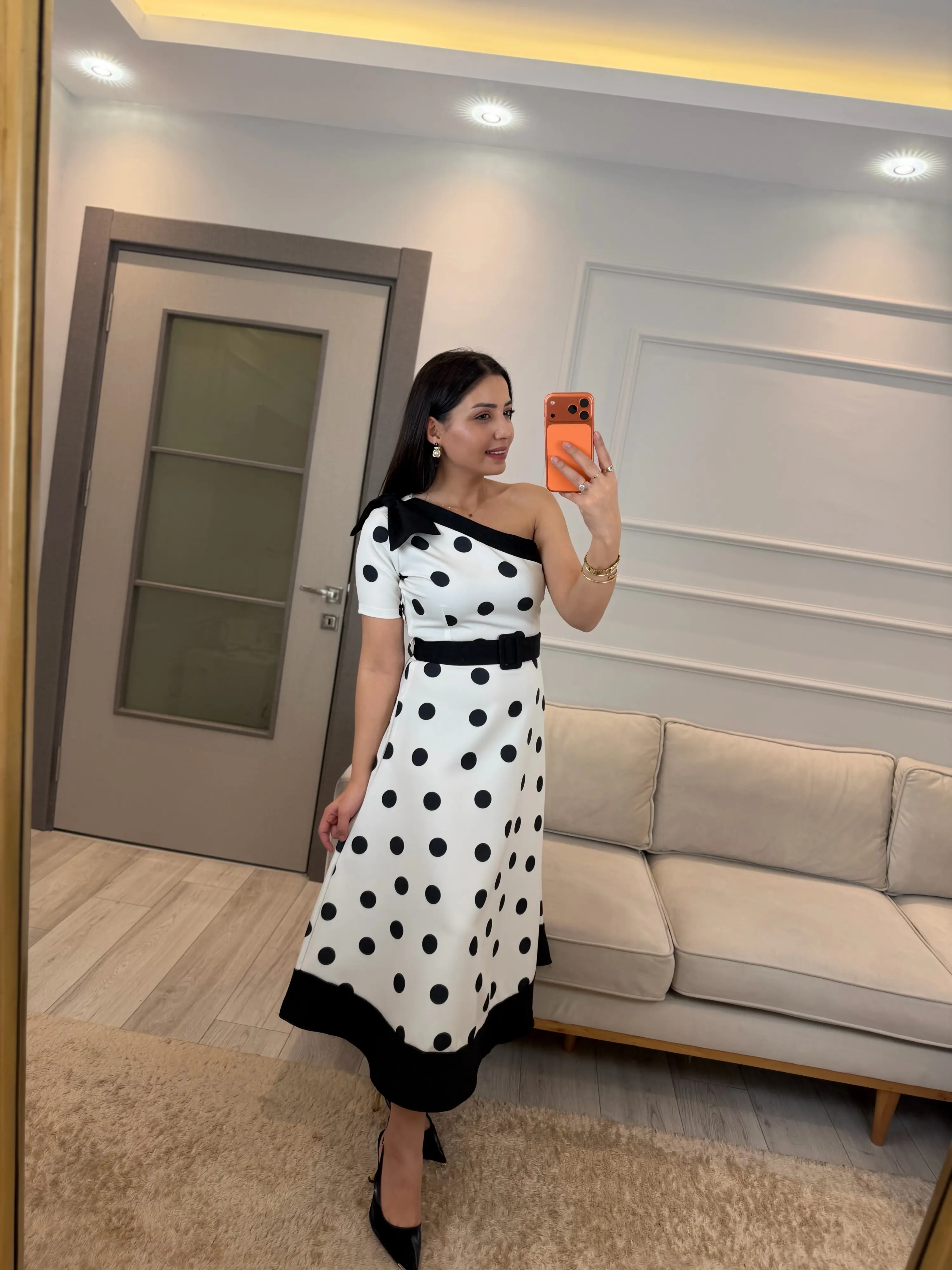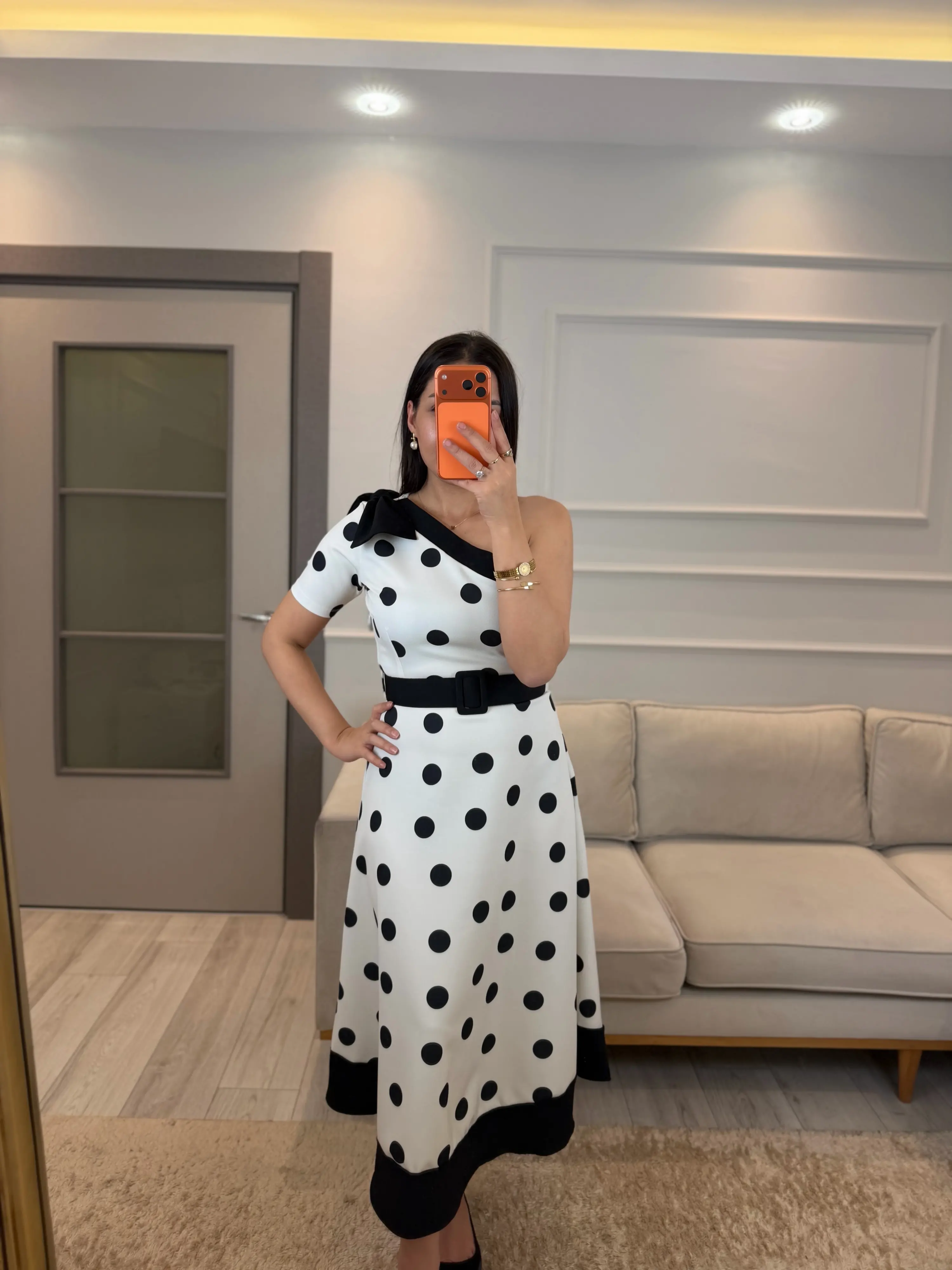 Tek Omuz Puantiyeli Kemerli Elbise