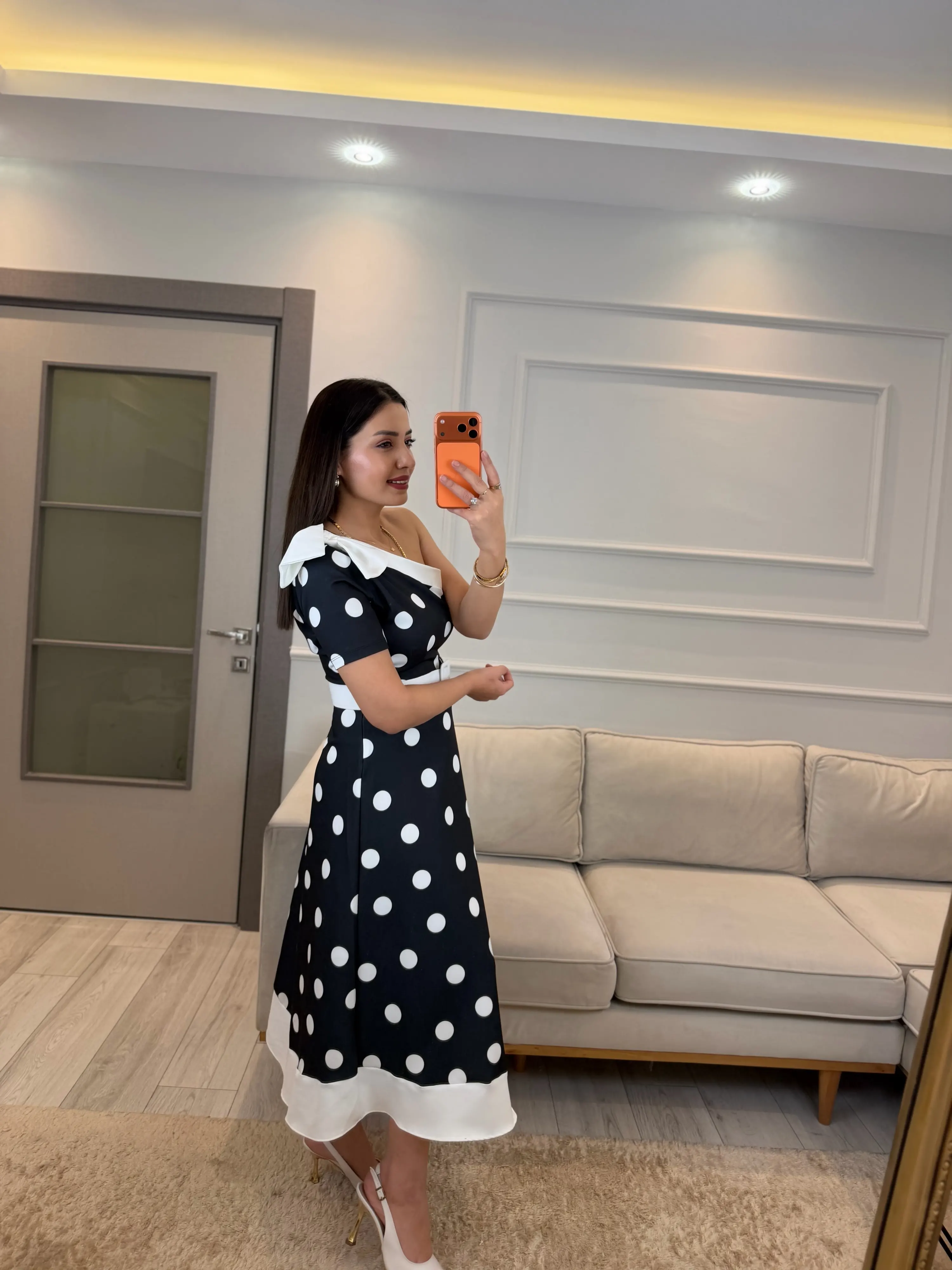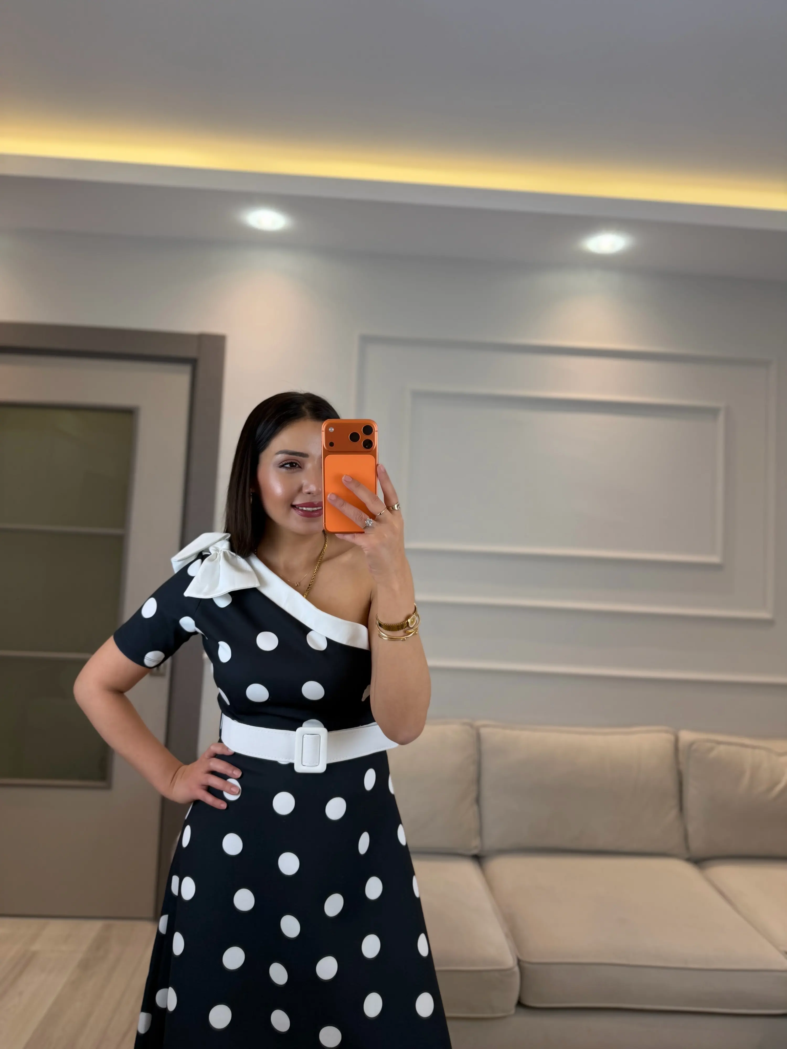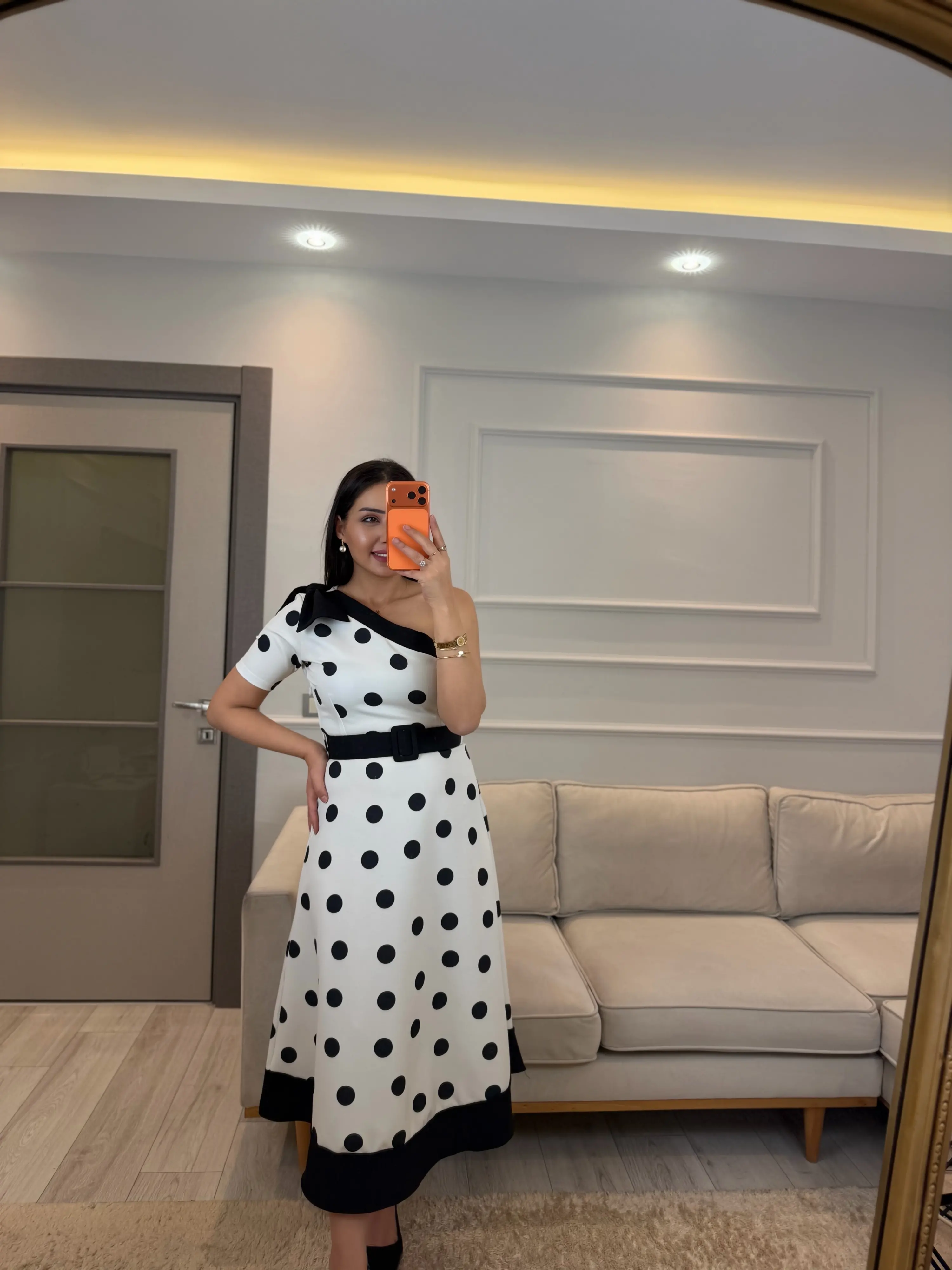 Tek Omuz Puantiyeli Kemerli Elbise