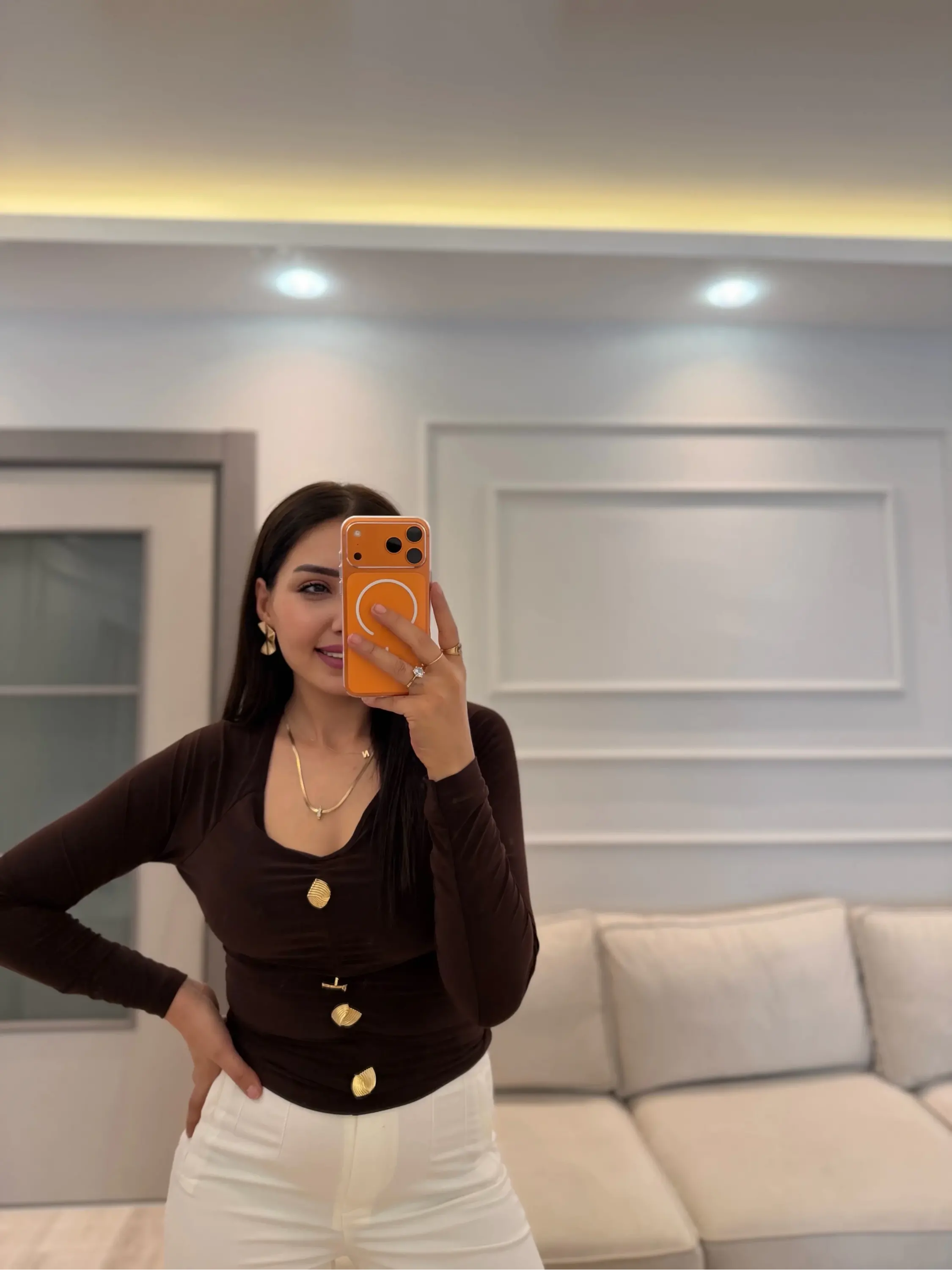 V Yaka Gold Düğmeli Sandy Bluz